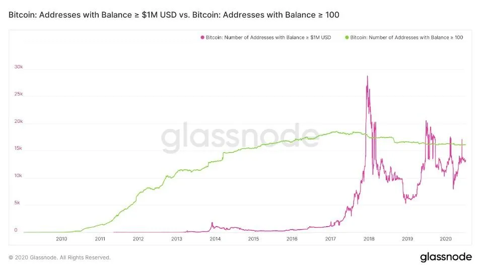 Найбільшу кількість адрес, де зберігаються біткойни загальною сумою в понад 1 мільйон доларів, було зафіксовано в кінці 2017 року, коли курс криптовалюти досягнув 20 тисяч доларів за один BTC. Водночас, аналітики стверджують, що встановити точну кількість біткойн-мільйонерів неможливо.