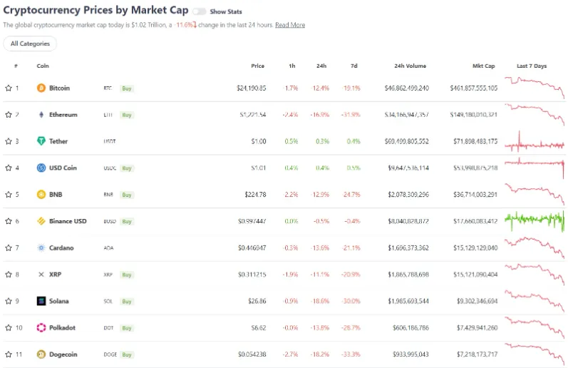 Из-за выше упомянутых падений, общая капитализация рынка снизилась почти на 11,6% и составляет менее 1,02 триллиона долларов. Индекс доминирования BTC – 45,2%, ETH – 14,6%.