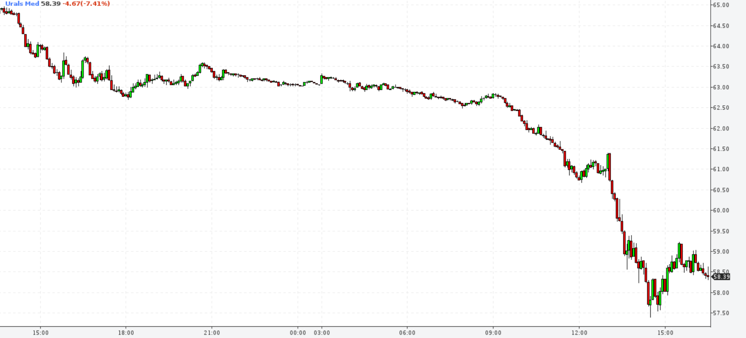 На момент создания этого материала, нефть Urals, которая является самой известной российской маркой в мире, торгуется на уровне 58,95 доллара за баррель. Сырье подешевело почти на 7% за сегодня. Более того, в первой половине дня 1 баррель нефти стоил примерно 65 долларов за баррель.