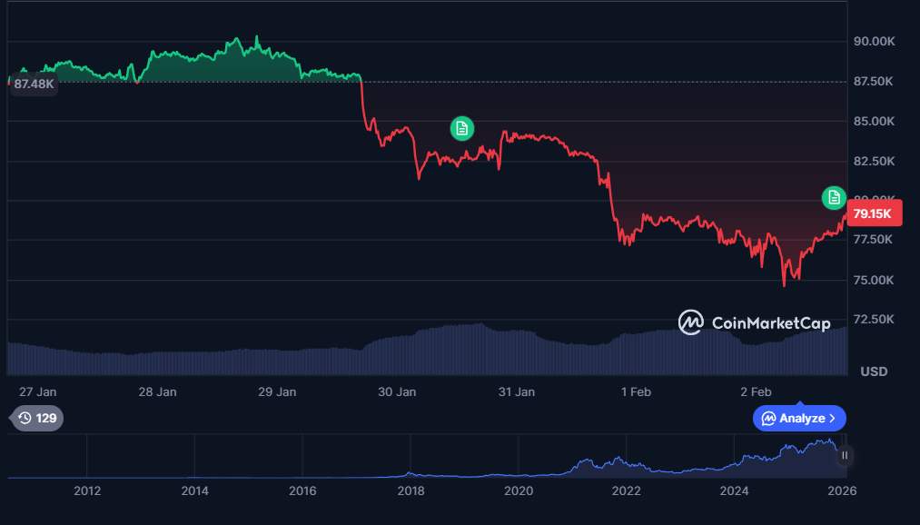 За тиждень найбільша криптовалюта у світі здешевшала на понад 11% й опустилася до найнижчого рівня з квітня 2025 року. Станом на 2 лютого біткойн торгувався в діапазоні 74 – 79 тисяч доларів, а ймовірність подальшого зниження існує.