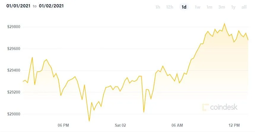 Станом на 10:59 2 січня вартість одного біткойна становить 29 828 доларів.